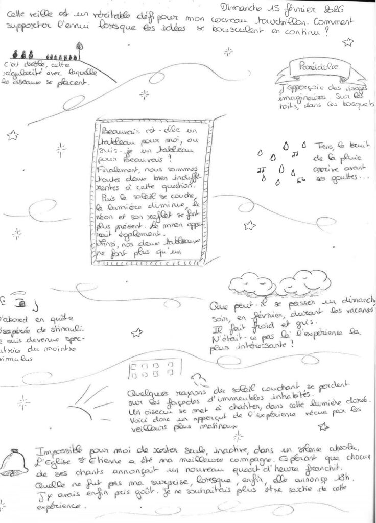 J’ai pu me repérer, je me suis repérée dans le temps avec le son des cloches de l’église Sainte-Étienne, non visible du lieu de veille.